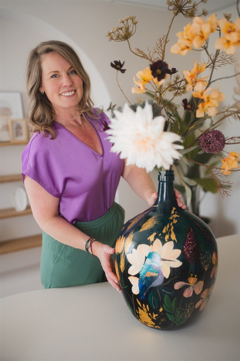 Wanneer de vaas klaar is, krijgt hij een beschermende afwerking en een gesigneerd certificaat van echtheid. Je kunt de vaas ophalen of laten bezorgen, klaar om een plek te krijgen waar hij echt tot leven komt.