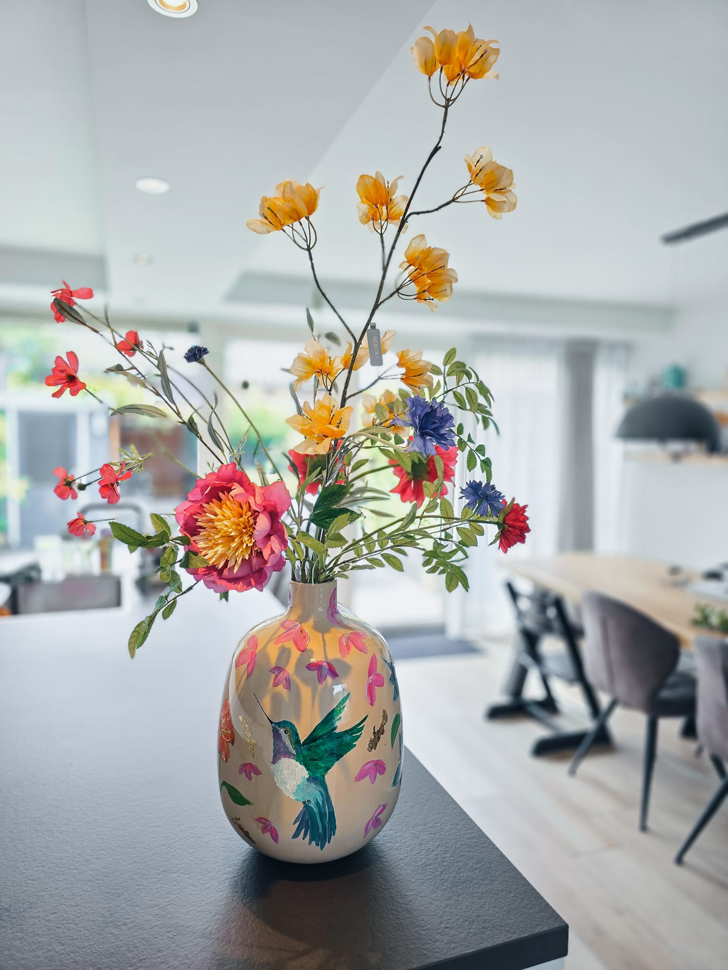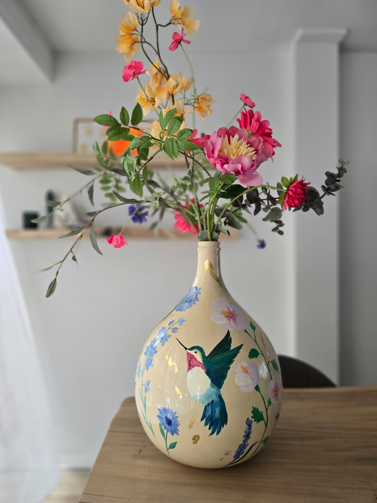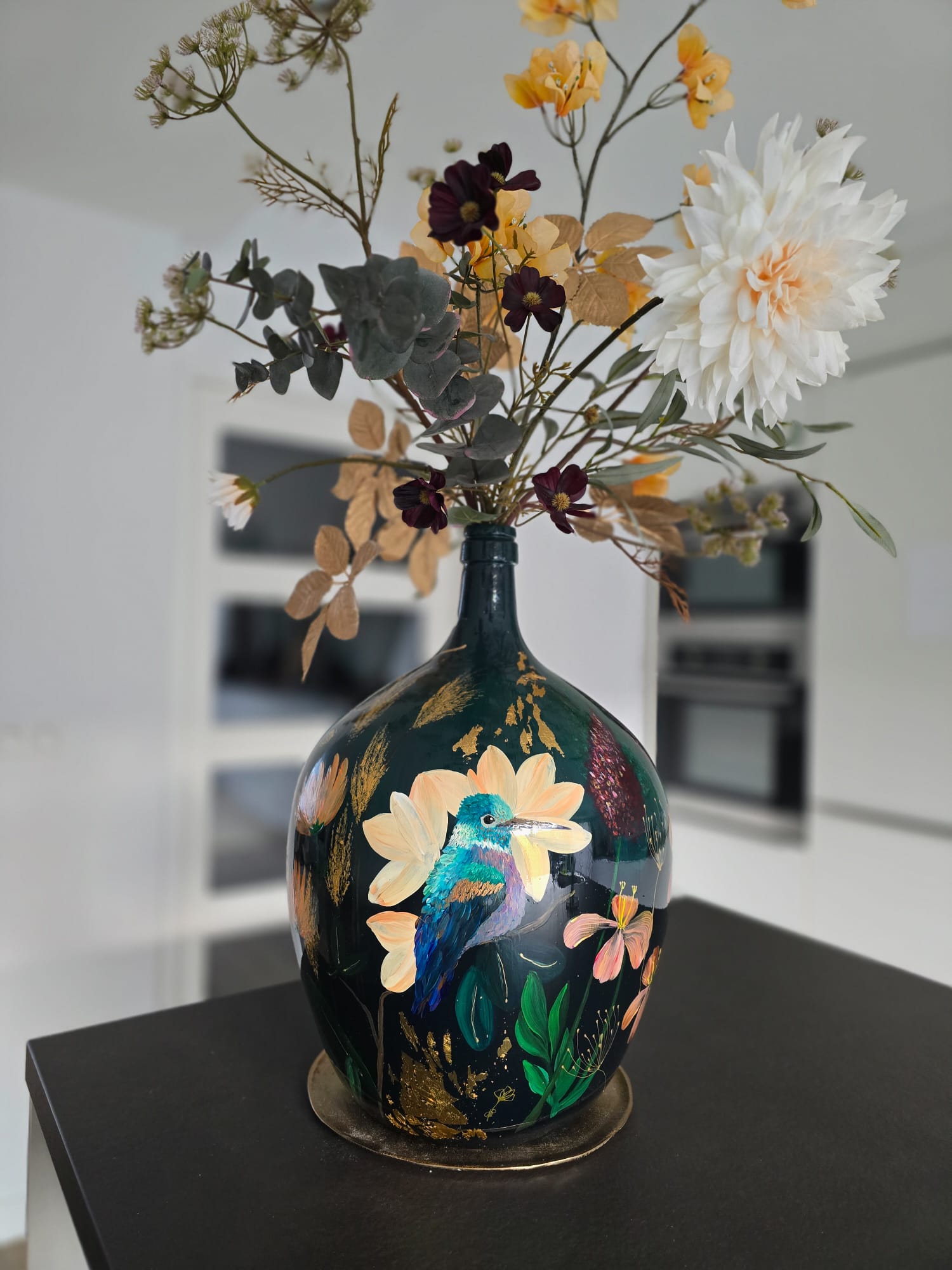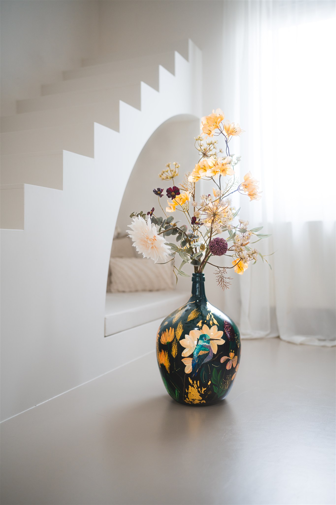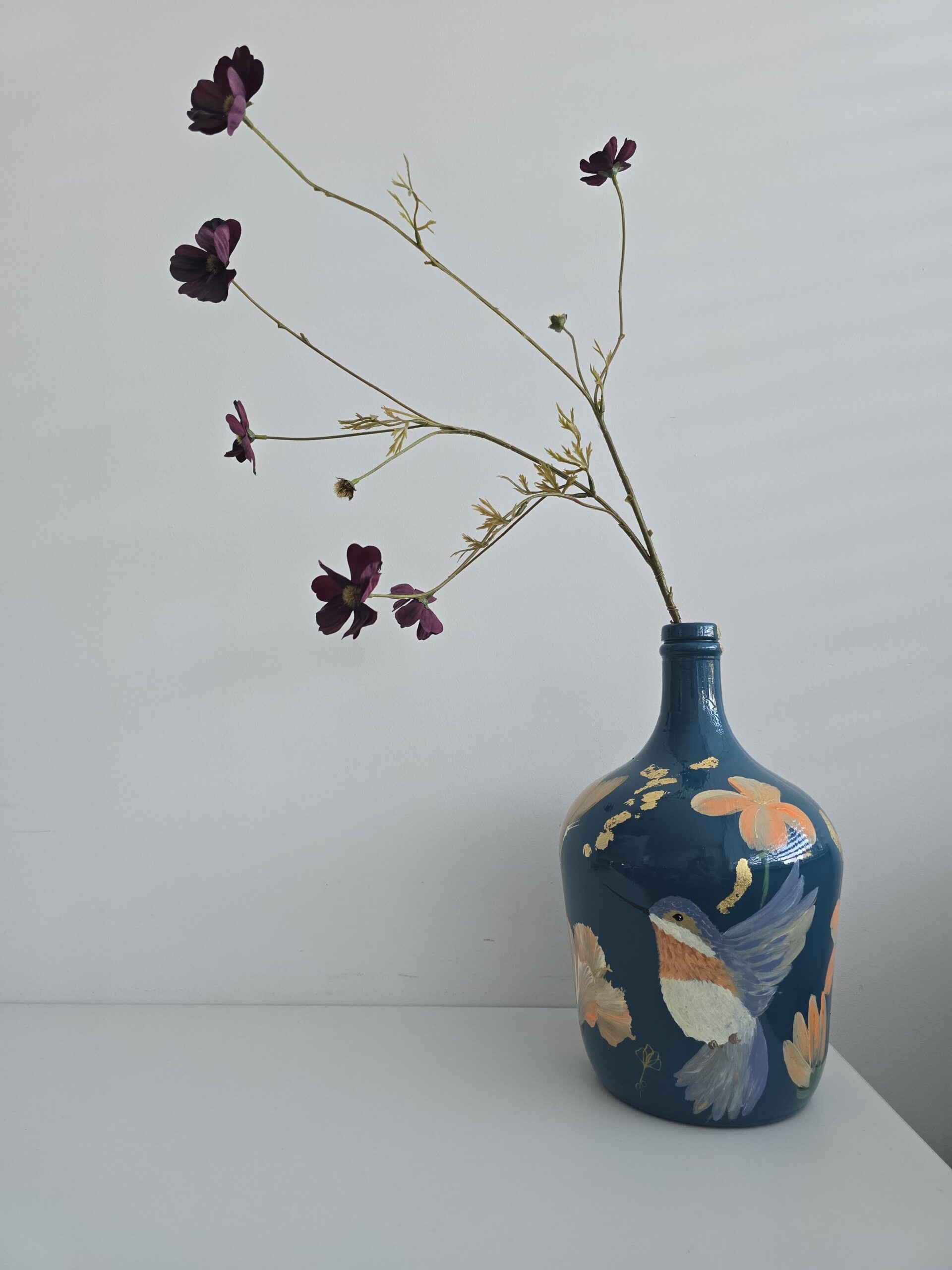 Wanneer de vaas klaar is, krijgt hij een beschermende afwerking en een gesigneerd certificaat van echtheid. Je kunt de vaas ophalen of laten bezorgen, klaar om een plek te krijgen waar hij echt tot leven komt.